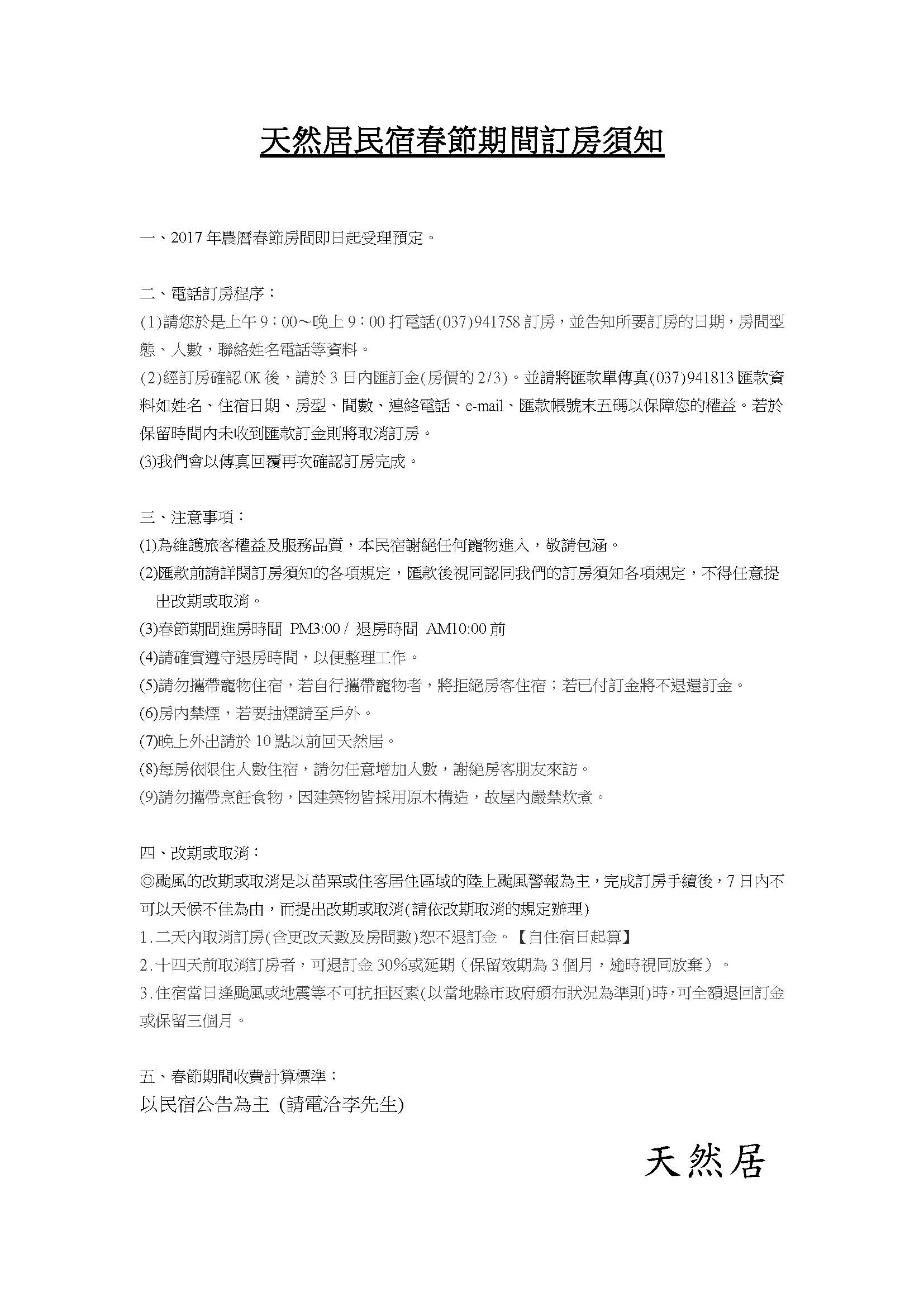 天然居民宿 『春節期間訂房須知』敬請閱覽!